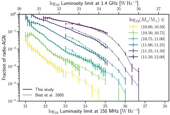 Fraction of galaxies hosting radio AGN brighter than a given radio luminosity, separated by their stellar mass (shown in different colours). Figure taken from [5]. Radio emission from AGN was separated from starformation using a number of criteria, see paper for details. The solid lines represent the results obtained at 150 MHz ([5]), and dotted lines show the results from [4] at 1.4 GHz (converted assuming a spectral index of 0.7). Reproduced with permission from Astronomy & Astrophysics, ©ESO.