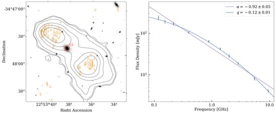 The continuum image (left) and integrated spectrum (right) of MIDAS J225543−344047 from [49]. Background image is a VIKING Ks band cutout set on a linear stretch. Three sets of contours are overlaid, representing the radio emission as seen by ASKAP EMU−ES (black contours, levels: [3, 4, 5, 7, 15, 30, 100] ), ATCA GLASS 5.5 GHz (orange contours, levels: [3, 5, 10, 20] ). Red marker indicates the positions of the host galaxy. Right: The radio continuum spectrum between 119 MHz and 9 GHz. A simple power-law and curved power-law model are fit to the spectrum, indicated by the purple and blue models, respectively. See [49] for details. Copyright © 2021, Cambridge University Press.