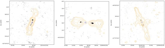 Examples of double–double radiogalaxies from the study of [54]. The yellow contours show the emission at 150 MHz from LOFAR while the grey scale represent the high frequency, high spatial resolution emission from follow-up VLA observations. The combination of the two highlights the presence of two sets of lobes. See [54] for details. Reproduced with permission from Astronomy & Astrophysics, ©ESO.