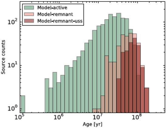 Distribution of ages which better describes the observations obtained from a mock catalogue, see details in [43]. Green marks active sources. Remnant sources (selected either from their morphology or their radio spectrum) are indicated in brown. Most of the remnants are “young” (light brown), i.e., in the phase shortly after the switching off (i.e., a few yr) and their low-frequency spectrum is not yet ultra steep. Remnants selected based on their steep, low-frequency spectrum are the older remnants in the sky (ages yrs).