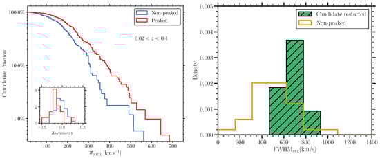 Left: Cumulative distribution of the [OIII] lines width (obtained from SDSS spectra) for peaked and non-peaked sources from the sample of Kukreti et al., in prep. Right: Average FWHM distributions of the [OIII] profiles of candidate restarted and the non-peaked radio AGN. Plots taken from [80]; see this paper for details.