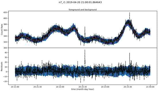 Quantile regression for estimating the count rates of detector n7 in energy range r1 over a three-hour period on 20 April 2019. The red line represents the  (median) estimate, while the blue shaded region denotes the range between the upper value at  and the lower value at . The spike observed at 23:30 corresponds to GRB190420981, whereas the one at about 22:30 is not present in the Fermi GBM catalog but is detected by [] and further discussed.