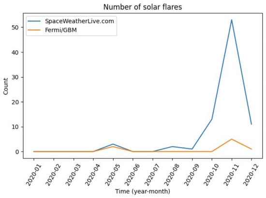 Solar flares counted by GOES-X satellite (source: spaceweatherlive.com, accessed on 10 January 2024) and by the Fermi GBM (source: Fermi GBM trigger catalog).