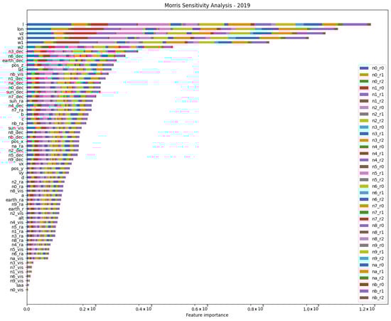Feature importance as determined by the Morris method for the 2019 dataset. Features are ranked by average importance, with the McIlwain L-parameter and Fermi longitude coordinate at the top. Conversely, certain detector flags indicating the Earth’s FoV occultation emerge as almost irrelevant factors in prediction. For a complete list of features and their descriptions, refer to Table 2 and Table 3.