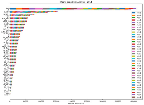 Feature importance as determined by the Morris method for the 2014 dataset. Features are sorted by their average importance, with the McIlwain L-parameter and Fermi longitude coordinate as the most influential. In contrast to Figure 4, detector flags representing the Earth’s FoV occultation play a significant role in prediction. For a complete list of features and their descriptions, refer to Table 2 and Table 3.