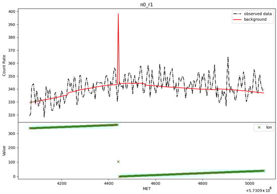Light curve of observed and estimated count rates for detector n0 in energy range r1. An unexpected peak appears in the estimated count rates due to an error in the dataset for the longitude estimation.