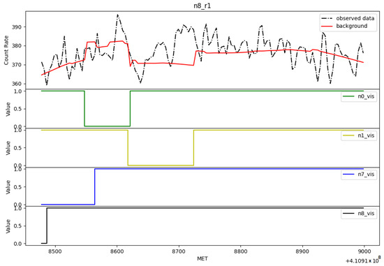 Another significant error type, more severe due to its contribution to false positive detections during the 2014 period (characterized by the solar maximum phase with numerous and significant solar flares), involves sudden steps in the background estimation. Figure 8 illustrates this behavior for detector n8 in energy range r1. In the SHAP analysis (refer to Figure 9), the most influential features are related to a flag feature: 1 indicates the detector is visible, while 0 signifies that its FoV is obscured by the Earth. Interestingly, what stands out is that detector n8 behavior seems influenced by the visibility of other detectors. This peculiar pattern cannot be attributed to data errors, as their correctness has been verified, but rather to a learned pattern within the neural network. Figure 8 presents the values of these features, demonstrating a clear correlation between the step behavior and changes in these flags.