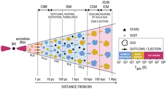 To assess the relationship between AGN and galaxy formation, we need to understand the physical processes that can be occurring over more than six orders of magnitude in spatial scales. The spatial scales of accretion flows onto SMBHs are sub-parsec. Indeed, the physics that determine both the final accretion on to black holes and the corresponding energy output can take place on extremely small scales, down to the innermost stable circular orbit. These accretion flows are fed from the surrounding circumnuclear region (CNR), which is considered to be on scales of ∼1–10 pc, and is also responsible for the significant obscuration of the central AGN (i.e., the torus [58]). Therefore, the interaction between the AGN and the material in the CNR can determine both the rate of black hole growth and the ability to observe AGN emission. Galaxies are typically considered to have their interstellar medium (ISM) located on scales from a few parsecs up to tens of kiloparsecs, and star formation primarily occurs within this ISM [59]. If AGN impact directly on the ISM (e.g., by entraining/expelling it, or by heating/exciting/ionising it; see Section 4), they have the potential to impact directly upon the efficiency of star formation within the host galaxy (see Section 5).