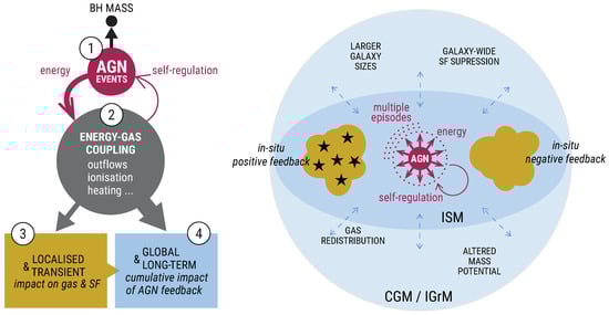 According to cosmological simulations, it is the cumulative output of several AGN events that are most relevant for the global and long-term impact on their host galaxies (see Section 6). The current AGN state of a galaxy is therefore not a useful proxy for studying the global and long-term impact of AGN feedback on gas and star formation, at least in the local universe (see [233] for a recent discussion of the potential impact of AGN feedback across cosmic time). However, by studying currently active AGN, using spatially resolved observations, we can obtain crucial information on the localised impact of AGN feedback (labelled as ‘3’ in Figure 2), which is needed to understand how the energy couples with the gas, and under which circumstances it enhances or reduces the star formation efficiency.