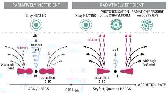 We will consider two main classes of AGN events: those which are “radiatively efficient”, where the accreting mass is efficiently converted to radiation, and those which are “radiatively inefficient”, where the converse is true1. Although a simplification, and a matter of ongoing research, we can broadly relate this dichotomy to the accretion rates and the resulting properties of the accretion flow. Sources with the highest accretion rates, i.e., those with luminosities ≳1% of their Eddington luminosity are expected to have a radiatively efficient accretion disc that is geometrically thin and optically thick. In contrast, black holes with lower accretion rates are expected to have radiatively inefficient flows that are geometrically thick and optically thin [79,80,81]. The spin of the black holes may also be crucial in determining the mechanical power output available through jets [82,83]. Potential methods of energy injection from these two AGN classes are summarised in Figure 3.