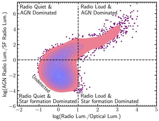Schematic representation of the data from Figure 12 in [106], showing a comparison between the ‘radio loud’ criteria for quasars (x axis) (i.e., R = / with a cut-off value at ) and the ratio of radio luminosity attributed to AGN to that attributed to star formation (y axis). Sources below the detection threshold of the surveys would fill out the bottom-left of this diagram.