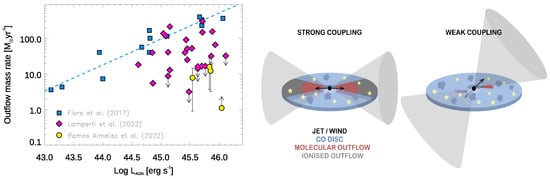 According to observational scaling relations found from the outflow measurements of AGN in the local Universe, the more luminous the AGN, the more massive and faster the gas outflows that it drives (e.g., [158,191]). However, these scaling relations were derived from observations of CO-bright targets known to have strong multi-phase outflows (e.g., Mrk 231 [192], NGC 1068 [193,194], IC 5063 [195,196]), some of them hosted in ultra-luminous galaxies (ULIRGs). More recent works have now started to populate the AGN luminosity-outflow mass rate plane with less biased AGN and ULIRG samples [161,162,167], and the linear relation vanishes (see left panel of Figure 5). This indicates that having a high AGN luminosity does not guarantee the presence of a massive outflow, as the coupling between energy and gas depends on other factors that we mention below.