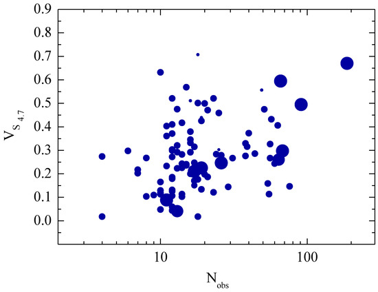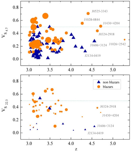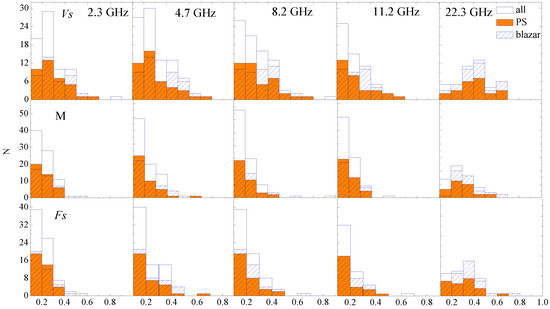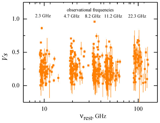 - The distribution of the variability index is significantly different at 22.3 GHz compared to lower frequencies, demonstrating the peak at higher levels of variability. This suggests that the emission from the compact core dominates at higher frequencies, while at lower frequencies, the emission from jet components could blend with the core emission, shifting the distribution peak to lower values. In general, the variability we obtained at the range from dozens to about a hundred GHz in the rest frame is attributed to the dominating core component in quasars;