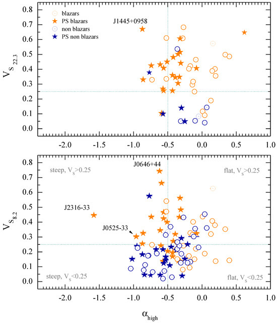 4.2. Spectral Variability of Identified HFP/GPS/MPS Quasars