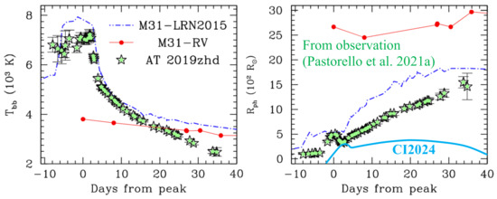 Ref. [88] calculated the blackbody temperature, , and radius of the photosphere of AT 2019zhd; I present two panels from their paper in Figure 1. To determine , they constructed the spectral energy distribution at any epoch with available multi-band photometry, mainly the g, v, r, i, and z bands, and corrected for reddening. They then apply Monte Carlo simulation to determine and the flux. With a distance of AT 2019zhd, they can calculate the photospheric radius, . Ref. [81] do not present their model’s blackbody temperature or radius. They do present the optical depth as a function of radius and time, which they calculate by integration over the density times the Rosseland mean opacity from the given radius, r, to their outer radius of , . I take their value of to approximately give the radius of the photosphere and added the line on the right panel of Figure 1 by a light-blue line marked CI2024.