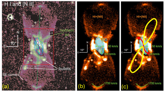 Figure of the LRN CK Vul (Nova 1670). (a) From [34]; (b) From [114]. The largest bipolar structure that fills the image is the nebular emission in lines of H and [N II]. The cyan contours show molecular emission of CO 1–0. The three dashed lines on panel (a) mark the three symmetry axes that [34] identified. In panel (c), I present my suggestion that the two axes that [34] mark in the inner structure form a point symmetric structure of one pair of precessing jets, while there is another pair of jets in an inclined angle that inflated two lobes, those that I draw with thick yellow lines.