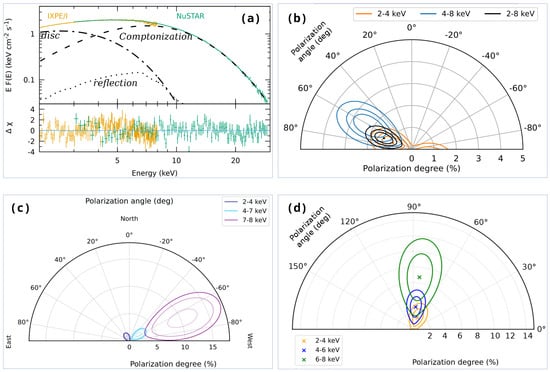 (a) IXPE and NuSTAR spectral data of GX 9+9 fitted with a model consisting of disk emission, Comptonization, and reflection (adapted from [18]). (b) PD−PA contour plots of GX 9+9 (68, 90, and 99% confidence levels; adapted from [18]), (c) 4U 1820−303 (50, 95, and 99% confidence levels; adapted from [20]), and (d) 4U 1624−49 (68 and 95% confidence levels; adapted from [21]).