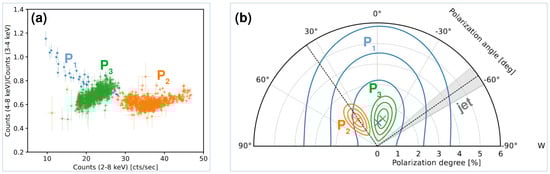 (a) Hardness−intensity diagram of Cir X-1 during the IXPE observations, highlighting the three different phase intervals (adapted from [26]). (b) PD−PA contour plots of Cir X-1 (68, 95, and 99% confidence levels; adapted from [26]).