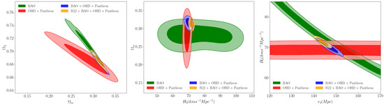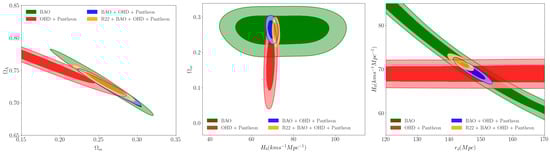 (Left panel): Marginalized posterior cosmic constraints on dark energy parameter density and matter density . (Center panel): Marginalized posterior cosmic constraints on matter parameter density and the Hubble constant , obtained from combining BAO with external data used to calibrate the BAO characteristic scale . (Right panel): Marginalized posterior constraints on the sound horizon at the baryon decoupling and the Hubble constant , which shows that R22 prior breaks the degeneracy between and .