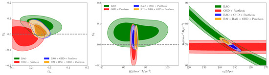 In this model, BAO measurements from DESI DR1 and DES Year 6 alone thus measure the parameters (, ), finding the following constraints values of , . Referring to curvature, we find . For the full dataset, we estimate the values of , , and at km , Mpc, , respectively. The value of for all data combinations as listed in Table 4 do not take a negative spatial curvature (), which is similar to the DESI result [38] and different from the results obtained by Planck for CMB alone [1]. The estimated results are very close to zero, so they do not rule out a flat universe.