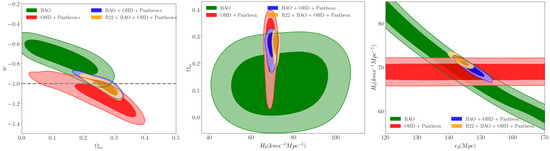 (Left panel): and marginalized posterior cosmic constraints on -w plane. (Center panel): and marginalized posterior cosmic constraints on - plane. (Right panel): and marginalized posterior constraints on the sound horizon at the baryon decoupling and the Hubble constant , which shows that R22 prior breaks the degeneracy between and .