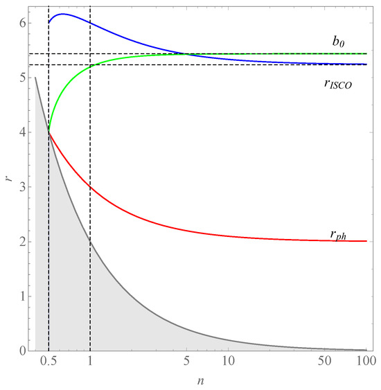 Dependence of ISCO position , photon sphere , and critical impact parameter on scalar parameter n. The shaved area represents the naked singularity.