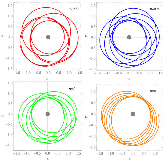 In Figure 2, we show the trajectory of the test particle orbiting around the compact object described the JNW spacetime. We draw the contour plot of the expression in (43) in the plane for the different values of the scalar parameter n, for particular values of the particle energy , eccentricity e, and expansion parameter . As one can see, the perihelion becomes larger when increasing the scalar parameter n.