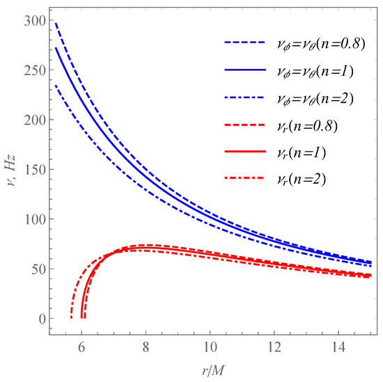 High-frequency QPOs at 40–450 Hz are thus of the right magnitude to be associated with the orbital frequencies near the ISCO radius of stellar-mass black holes. Interestingly, we also have evidence of high-frequency QPOs in supermassive black holes (<1 ) [52] and intermediate-mass black holes (∼1 ) [53]. After restoring the unit, we present radial dependence of of fundamental frequencies in Figure 3 for different values of the scalar parameter n.