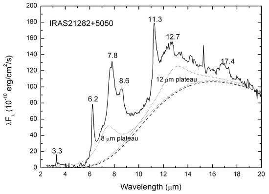 - Kwok, S.; Volk, K.; Bernath, P. On the Origin of Infrared Plateau Features in Proto-Planetary Nebulae. Astrophys. J. 2001, 554, L87–L90. [Google Scholar] [CrossRef]