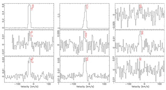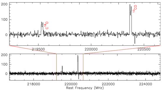 As a spectrometer, we used the fast Fourier transform (FFT) units covering the whole 32 GHz observed (8 GHz × 2 receivers × 2 polarizations) with a resolution of 200 kHz, equivalent to a velocity resolution of ∼0.67 and 0.27 km s−1 at 90 and 220 GHz, respectively, though the data have been smoothed to a final velocity resolution of 3.25 km s−1 for improving the S/N of the spectra. We follow the standard calibration procedure at Pico Veleta, observing hot and cold loads (at ambient and liquid nitrogen temperatures) and the blank sky approximately every 20 min. Hot and cold loads are used to scale spectrometer units into temperature units, while observing the sky brightness provides a measurement of the transmission properties of the local atmosphere via numerical modeling [27]. As a consequence, data from the spectrometer are delivered in (atmosphere-corrected) antenna temperature (). The expected absolute calibration accuracy is about 10% for 3 mm data and 15% for 1.3 mm data. However, the relative calibration of the lines simultaneously observed within the same receiver, as in the case of CO, CO, and CO, is nearly perfect.