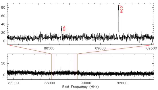Same as Figure 1 but for the E090 receiver. The two lines identified in the spectrum, HCN and HCO+J = 1 − 0, are indicated.