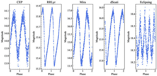 We only selected a few of classes which have an adequate number of distinct light curves (∼500 or more) for the stable training of the classification model. Rather than attempting to compile all known variable star classes, as attempted with limited success by [23], we focused our research on a subset of five well-studied classes. The five chosen classes are Classical Cepheids, Scuti, Mira, RR Lyrae and Eclipsing Binaries. Typical phase-folded light curves for each class are presented in Figure 1.