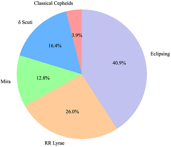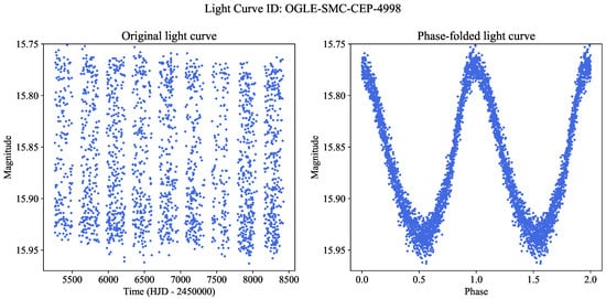 Variable stars play a crucial role in expanding our understanding of the universe, contributing to various fields including stellar astrophysics, galactic astrophysics, and cosmology. They have been instrumental in key discoveries, such as determining distances to galaxies, measuring the Hubble constant, studying stellar evolution, investigating planetary formation, and studying the chemical composition of different galactic regions [1,2,3,4,5,6,7,8,9,10,11]. To study these stars effectively, modern astronomical surveys have provided massive datasets. With the advent of advanced astronomical instrumentation and large-scale time-domain surveys like the Optical Gravitational Lensing Experiment (OGLE) [12,13,14,15], the All-Sky Automated Survey (ASAS) [16], the Catalina Real-Time Transient Survey (CRTS) [17,18], the Zwicky Transient Facility (ZTF) [19,20], and NASA’s Kepler mission [21], the volume of time-series data available has surged dramatically. These datasets, consisting of light curves that capture the brightness of stars over time, are invaluable for studying variable stars. However, the sheer quantity and complexity of these data necessitate automated classification methods. The automatic classification of variable stars allows astronomers to maximize the scientific return from these surveys, especially as manual classification is impractical given the sheer volume of data.