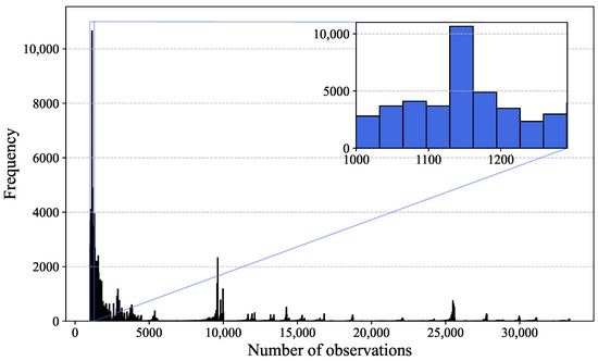 Distribution of light curve lengths (number of observations) in the dataset. The inset highlights the most common range of observations, with the peak occurring around 1150 observations.