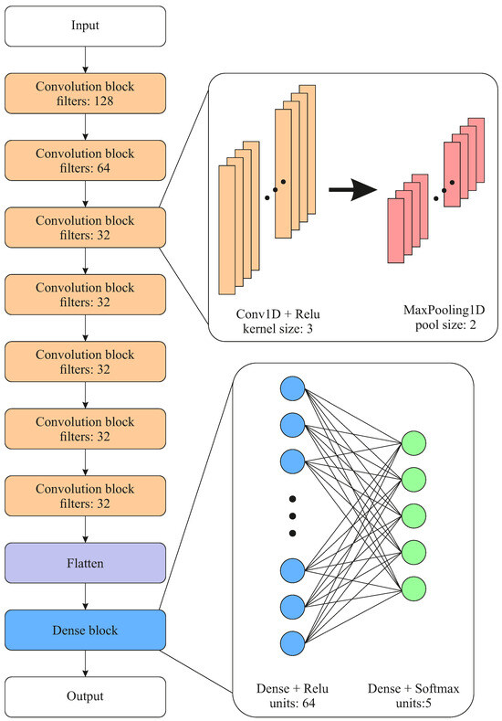 In this work, we utilized the CNN architecture described in [47], as illustrated schematically in Figure 5. Our CNN model consists of seven convolutional blocks followed by two dense layers, with a softmax activation function applied at the output layer. Each convolutional block includes a 1D convolution layer with ReLU activation and a 1D MaxPooling layer. The Conv1D layer uses a kernel size of 3, while the MaxPooling1D layer has a pool size of 2, and both layers use the same padding. The convolutional layers are configured sequentially with filter sizes of 128, 64, 32, 32, 32, 32, and 32. The dense layers comprise 64 neurons in the hidden layer and 5 neurons in the output layer, activated by Softmax. This model has a total of 60,517 parameters. We implemented and trained the CNN using TensorFlow 2.1 [48] (Google Brain, Mountain View, CA, USA), optimizing it with the Adam optimizer [49] at a learning rate of 0.001 and a batch size of 32. Categorical cross-entropy was chosen as the loss function. Training was conducted for 100 epochs, with each epoch taking approximately 8 s.