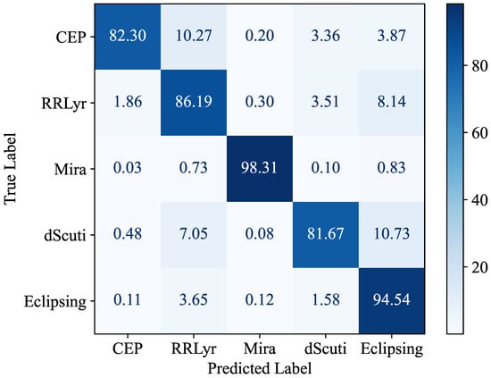Another notable misclassification occurred between Cepheids and RR Lyrae stars, where our classifier showed a misclassification rate of 10.27%. This confusion can be attributed to the similarities in the shape of their light curves, especially for short-period Cepheids, whose variability features can resemble those of RR Lyrae stars. Both types of stars exhibit asymmetric light curves with a sharp rise and a slower decline, which can lead the classifier to confuse them, particularly when their periods and amplitudes overlap. One contributing factor to this misclassification is the inclusion of all types of RR Lyrae stars in our dataset, particularly RRc (first-overtone RR Lyrae), which are often confused with first-overtone Cepheids. Both RRc stars and first-overtone Cepheids exhibit relatively short periods and similar light curve shapes, increasing the likelihood of confusion. Since the underlying pulsation mechanisms for both types are driven by the same physical processes, distinguishing between them can be challenging for automated classification systems [51]. This misclassification pattern was also observed in the findings of [37,52], where a similar misclassification rate of 21% and 20% was reported. Remarkably, Scuti variables were classified by our method with ∼25% higher accuracy than with the RF classifier.