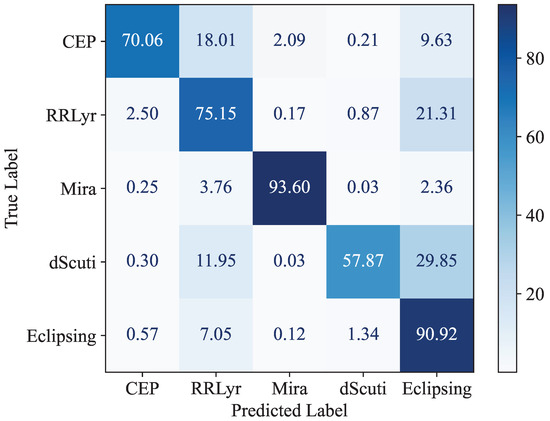 Figure 6 and Figure 7 present the confusion matrices obtained from one of the runs of our model and the RF classifier, respectively. The confusion matrix of our model demonstrates that our classifier successfully recovered 88% of the true labels on average, with inter-class contamination rates below 11%. The highest confusion was observed between Scuti and Eclipsing variables, with 10.73% of Scuti stars being misclassified as Eclipsing Binaries. The misclassification is likely due to the similarities in the light curves of Scuti stars and Eclipsing Binaries, particularly in cases where their periods overlap. Both Scuti stars and EW-type Eclipsing Binaries exhibit periodic variability with relatively short periods and moderate amplitude changes. Scuti stars pulsate due to internal pressure-driven mechanisms, while Eclipsing Binaries experience periodic dips in brightness due to mutual eclipses of their stellar components. However, the smooth, sinusoidal-like light curve of Scuti stars can resemble the symmetric light curves of Eclipsing Binaries, especially Contact Binaries. This overlap in light curve features and period ranges contributes to the difficulty in distinguishing between the two types. This finding is consistent with the results reported by [37], where their classifier exhibited a 17.76% confusion rate between these classes.