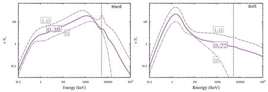 The best-fit hybrid pair plasma models for the coronal emission component of Cyg X-1 in the soft and hard states (in purple). The models were calculated using Eqpair [133] based on the best-fit parameters in Nowak et al. [134], Gierliński et al. [135]. The grey models show the spectra for a different fraction of power supplied to the non-thermal distributed particles. Notice the significant increase in hard X-ray emission and the prominent annihilation line at 511 keV when the fraction of non-thermal particles increases. When the non-thermal fraction decreases to zero, this model is consistent with the purely thermal Comptonisation model (e.g., [136]). Note that the annihilation line at 511 keV is still present but only is broadened when the non-thermal fraction is low.