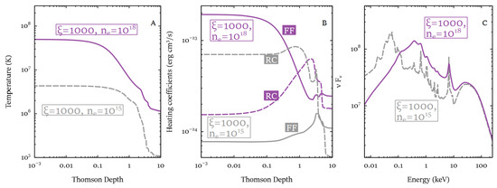To further demonstrate the effects of high-density plasma, Figure 4 shows the impact of high density on plasma emission, calculated using the Reflionx code [146]. The left panel shows that the disk surface temperature is significantly higher when the electron density is high. This is due to higher heating coefficients (heating rates divided by ), as in the middle panel. The solid curves represent the heating coefficients due to free-free absorption (FF), which increase significantly with density, while the dashed curves show the heating coefficients due to recombination cascade (RC). Recombination processes in Reflionx have three main components: radiative recombination, three-body recombination, and dielectronic recombination. Radiative recombination occurs when a positively charged ion captures an electron into one of its bound orbits, with simultaneous emission of a photon. In the dielectronic recombination process, the energy released during the capture is used to promote a bound electron to another bound orbit.
