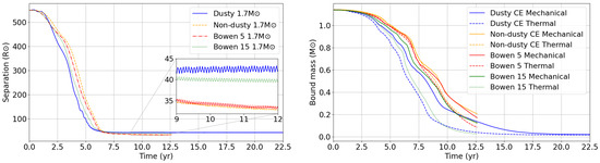 Evolution of the separation (left) and bound mass (right) in the 1.7 model for different dust implementations based on the nucleation model (dusty), the absence of dust (non-dusty), or the Bowen model with two values of and 15 cm2 g−1. For the estimate of the bound mass, we consider the two definitions of the total energy: the mechanical one associated with and the thermal one linked to .