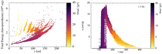 The left panel of Figure 2 shows, as a function of distance from the AGB star, the total energy of the particles when the dust starts forming efficiently. We arbitrarily trace this moment by selecting the particles when the dust opacity reaches cm2 g−1 (the distribution of particles in this plot is weakly dependent on this threshold opacity). As can be seen, the total particle’s energy is always positive, indicating that dust is forming in the unbound material. This explains why dust has such a small effect on the unbound mass (Figure 1). The color of the particles refers to the time of dust nucleation in years (). Initially, dust forms in the inner region (yellow color), and by the end of the simulation, it is active through almost the entire envelope (up to ∼200 au). Dust forms as early as 1 year from the onset of the simulation and occurs preferentially in a shell that expands, grows thicker, and becomes more symmetric. Movies illustrating the evolution of the structure and of various quantities can be found at (accessed 21 November 2024) https://tinyurl.com/y455avdj. The opacity in the shell increases and by the end of the in-spiral phase, reaches a maximum of around cm2 g−1 (Figure 2, right), making it optically thick (see Section 3.3). We also note that contrary to the 3.7 model, the shell in the 1.7 model is slightly elongated in the polar direction. This is likely related to the different mass ratios and initial separation. More details about the evolution of the dust properties can be found in [12].