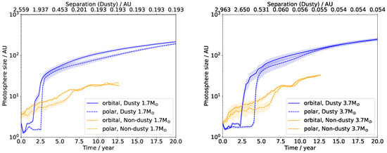 As previously mentioned, the formation of dust in the expanding envelope does not significantly impact the hydrodynamics, but it can substantially affect the appearance of the object. To estimate the photospheric radius, we performed simple inward ray tracing to determine where the optical depth first reaches . The integration is made along the x, y, and z axes and then averaged to obtain the polar (along ) and equatorial ( and ) radii. As shown in Figure 4, the photosphere initially grows more rapidly in the orbital than in the polar direction, tracing the asymmetries in the flow. By 2.5–5 years, the polar and equatorial photospheric radii become very similar, making the envelope appear roughly spherically symmetric. Without dust and with a lower mass ratio, we find that asymmetry is more pronounced. The main effect is the much larger photospheric radius of the dusty simulations, making the object appear almost ten times bigger. Our simulations do not reproduce the very non-spherical, bipolar morphology seen in central stars of planetary nebulae (CSPNe). This discrepancy arises partly because our models show that the release of recombination energy that allows dust to form produces a more spherical ejection. Additionally, we do not account for the interaction of a fast wind with the ejected envelope during the planetary phase, which has been shown to produce bipolar outflows (e.g., [23]).