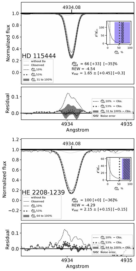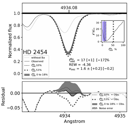 Figure 1 shows the fits of the Ba II resonance line at Å. The best fit, determined from the smallest residuals, is highlighted in violet across all panels. The barium isotopic fraction, , is derived by finding the best match between the synthetic spectra, obtained by varying , and the observed spectrum, as quantified by the minimum normalized (see insets in each panel of Figure 1).