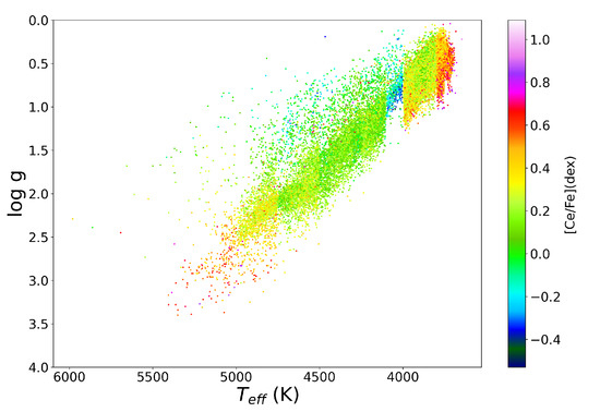 In [59], cerium abundances were determined from Gaia RVS spectra using the GSP-Spec module. As expected, most cerium-enriched objects are found on the asymptotic giant branch, at K. Interestingly, a subpanel of their Figure 3, which shows a Kiel diagram (log g, ) color-coded with Ce abundance, reveals a group of cerium-enriched stars located at and 4500 K < K, as shown in Figure 2.
