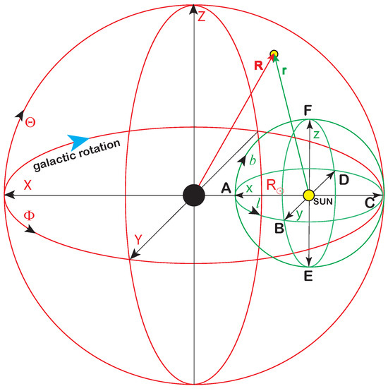 - Schönrich, R.; Binney, J.; Dehnen, W. Local kinematics and the local standard of rest. Mon. Not. R. Astron. Soc. 2010, 403, 1829. [Google Scholar] [CrossRef]