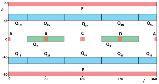 The data sectors of the sky used for analysis are defined in Figure 2 and Table 1. The narrow sectors A–F are defined by basic directions (from the Sun, see Figure 1): towards the centre of the galaxy (A), along the direction of galaxy rotation (B), and their opposites (C,D). The perpendiculars to the galactic disk define sectors E and F. The analysis is extended by other sectors: Qα—in the galactic disk and —outside the disk. We only accept sources with a positive parallax and limited distance kpc that satisfy the following condition:
