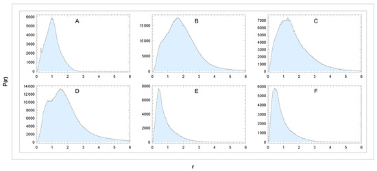 Distribution of distances in the sectors (A–F). Unit: r[kpc]. Binning: 0.024 kpc.