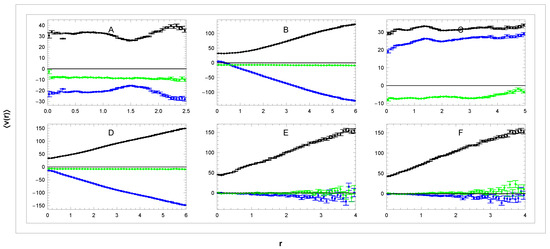 Dependence of mean velocity (—blue, —green, and —black) on distance r in the galactic reference frame in sectors (A–F). Units: r[kpc], v[km/s].