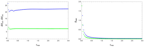Radius represents the distance of the Sun from the galactic centre. The values obtained in the measurements are in the interval 7.1–8.92 kpc [26]. For our analysis, we used the recent value kpc [29]. The small parameter kpc [30] defining the position of the Sun above the galactic plane is neglected in our analysis. The validity of this approximation will be commented on in Section 3.3.