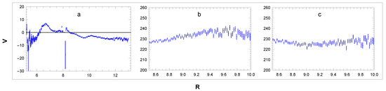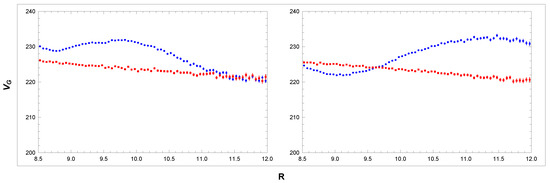 (2) The determination of RC is based on the model-independent definition (15). In Figure 8 and Figure 10, we show RCs measured in different sectors of galactic longitudes. The curves are obtained with very high precision, so as a result, we observe local fluctuations ( km/s) in the structure of the MW rotation. These fluctuations correspond to the velocity substructures and non-axisymmetric kinematic signatures mentioned in Section 1. The fluctuations do not allow us to analyse the RC slope in our limited range of R. Further, we showed that the collective rotation velocity decreases for increasing , see Figure 11. A similar observation was reported in [21,48]. The slope of the curves is defined in Equation (56) and can be compared with a prediction [50] (Figure 5) of the Besançon model. Within the range of our analysis (0–3 kpc), the average slopes agree very well, although the shape of the curves is slightly different.
